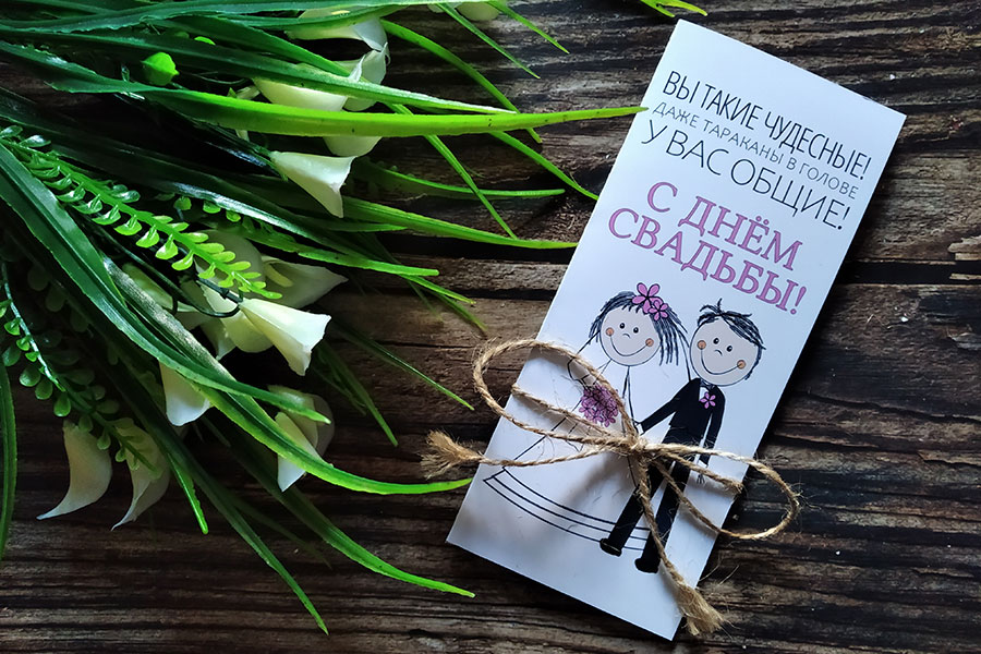 Красивая конверт-открытка c Днём Свадьбы! Свадьба - уникальное событие в жизни человека. Когда двое людей находят друг друга среди миллионов и собираются свести свои судьбы на всю жизнь - это естественно повод для праздника. И для такого грандиозного события мы и создали этот позитивный и смешной шаблон конверта-открытки.